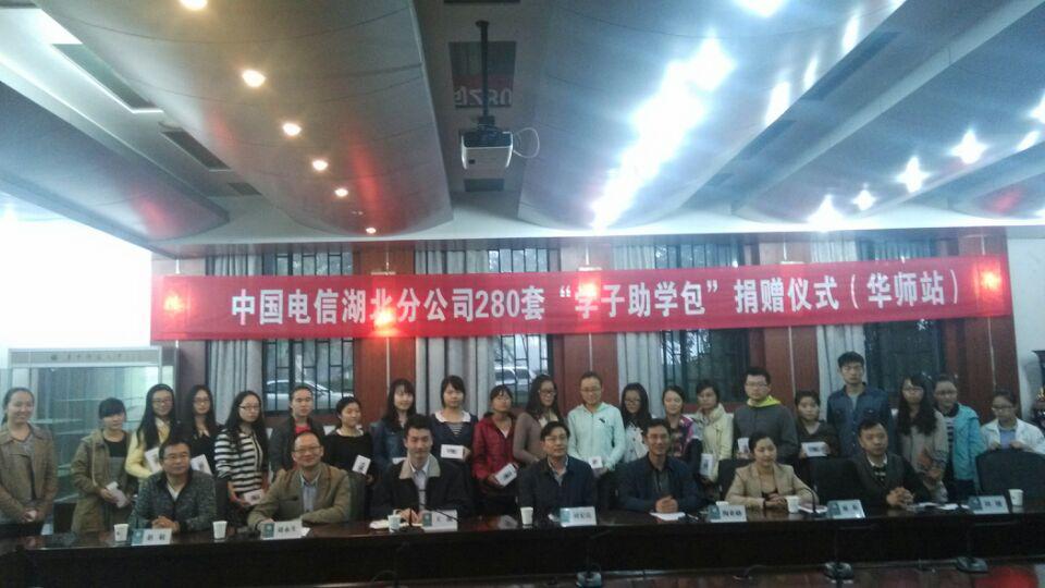 10月28日,中国电信湖北分公司“学子助学包”捐赠仪式在我校行政楼一楼会议室成功举行。此次“飞YOUNG青春、翼起梦想”助学活动由我校与团省委、中国电信湖北分公司等单位共同开展,电信公司将为我校280名家庭经济困难学生赠送含“海信E260T+”手机一部和号卡赠费,计2023元的“学子助学包”。