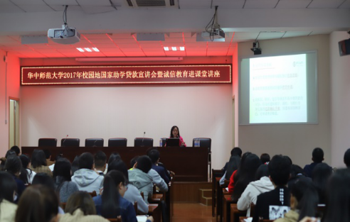 11月9日上午10点,华中师范大学2017年校园地国家助学贷款宣讲会暨诚信教育进课堂讲座在大学生活动中心403教室举办。本次活动邀请了中国银行东湖支行国家助学贷款负责人张洁经理主讲,各年级贷款学生共同参加了本次活动。活动由资助中心王贤磊老师主持。