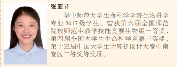 张亚芬同学是华中师范大学生命科学学院2017级生物科学专业的一名本科生,其学年度平均学分绩90分以上,综合素质位居专业第一,同时疫情期间积极投身于线上助学。曾获得华中师范大学校级最高荣誉——2020年“校长奖”,获国家奖学金、国家励志奖学金、逸华励志奖学金。在“田家炳杯”第六届全国师范院校师范生教学技能竞赛中荣获生物组一等奖;带领团队获第四届全国大学生生命科学竞赛三等奖,获第十三届中国大学生计算机设计大赛中南赛区二等奖。连续三年获“校三好学生”,以推免成绩专业第一保送至武汉大学生命科学学院院长宋保亮教授门下攻读生物化学与分子生物学专业硕士。对标三级师范认证高标准,她不断锤炼教学技能,炼就科研本领,勇担青年责任,立志做华师培养的卓越教师,为党育人为国育才奋斗终生。