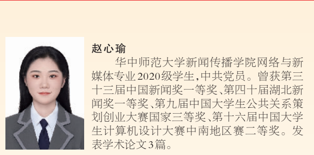 在校期间,赵心瑜,积极参加学科竞赛,先后发表新闻作品50余篇,专业排名第一,荣获国家级等各类奖项10余项,在《长江日报》实习期间,协助完成稿14篇,字数超5万字,全网阅读量超9000万。她参与报道的通讯作品《痛心!协和专家:在兴趣班学的这个动作已致1000多名中国孩子瘫痪》,获得第33届“中国新闻奖”一等奖,是该奖项迄今为止历届获奖者中唯一在校生。她还作为国际志愿者,积极参与对外传播国际支教,辐射人数超400人。
