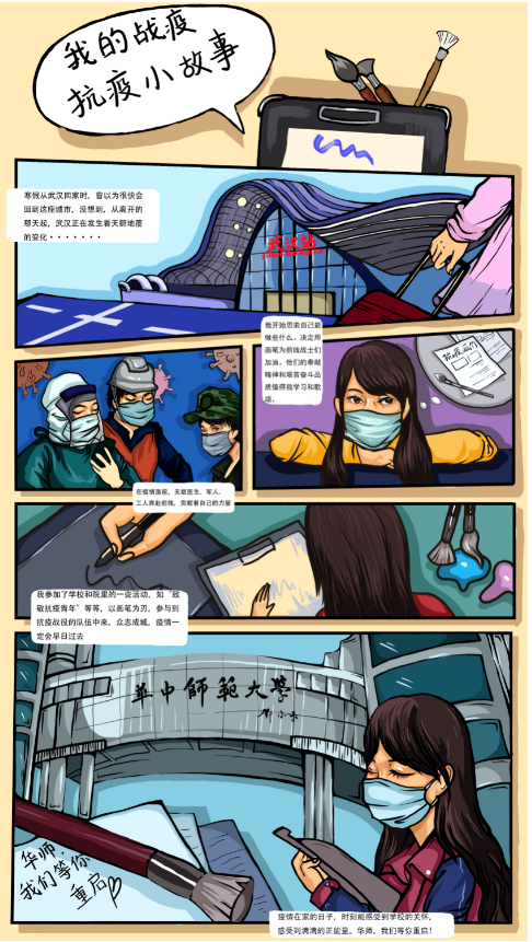 2020年开始,一场疫情打乱了人们的生活,一切都是始料未及。疫情发生以后,看到电视上、手机里传来的报道,对于武汉——这个我学习和生活了一学期的城市,从疫情爆发到封城,我有着满满的焦急和关切。看到那么多年轻的医护工作者、军人以及奔赴抗疫前线的战士们,我由衷的对这种舍身报国、艰苦奋斗的精神打动,也希望通过手中的画笔,贡献一点自己的力量。在参加了学校组织的一些绘画任务的同时,也能从平时的讲座、晚点名,还有每天的保平安等等,感受到学校无时无刻的关怀,非常感动。我们与华师同在,相信在大家的共同努力下,疫情会早日过去,桂子山能够变得更加美丽和美好。